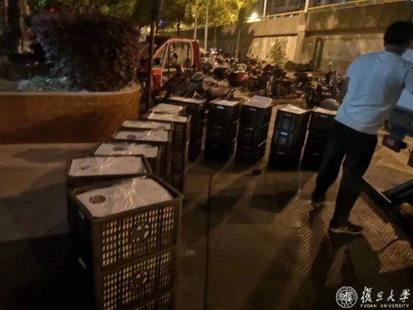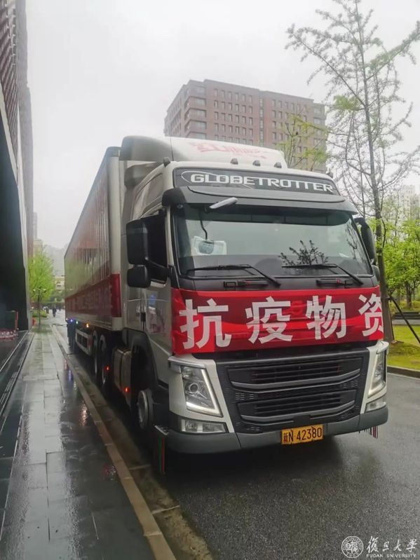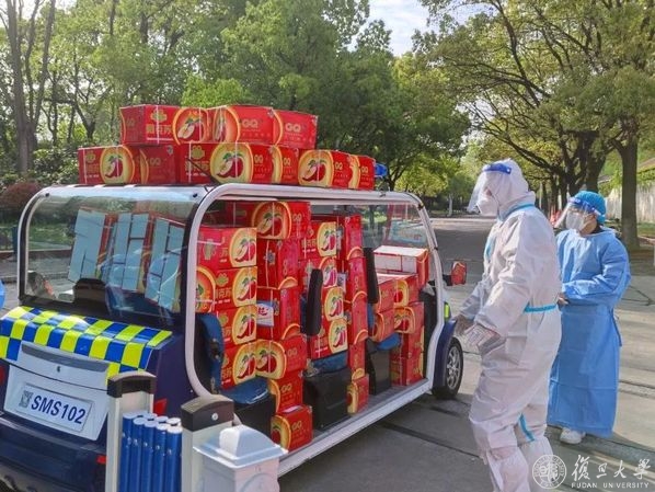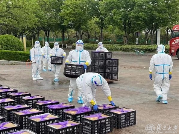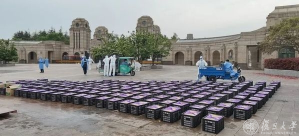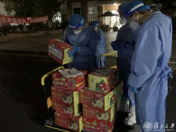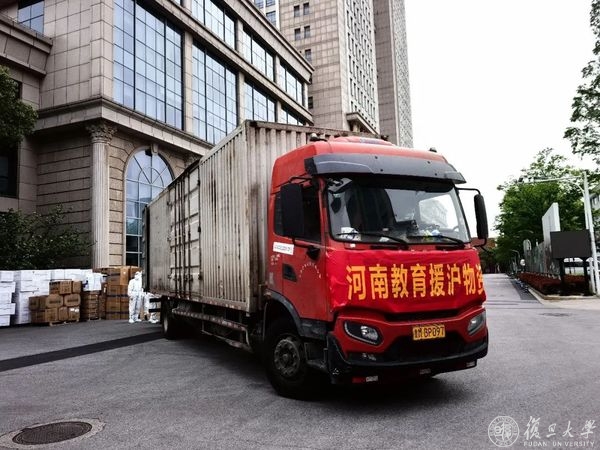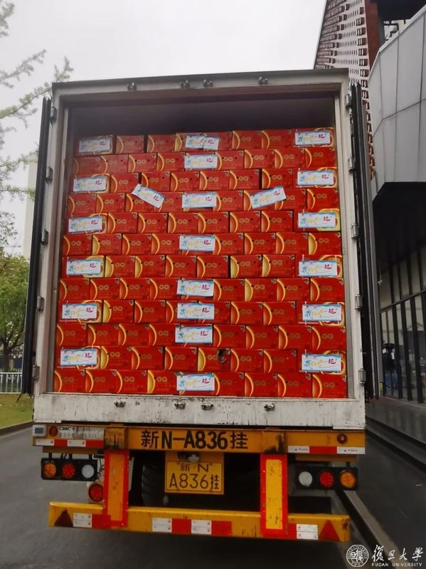 在河南省委、省政府的大力支持下,由中共河南省教育工委、河南省教育厅共同捐赠的2020箱水果与近30000件防疫用具也已于近日运抵复旦校园。