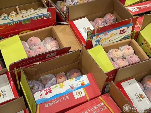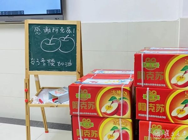 终于,4月14日,一箱箱贴着“我们在一起”标识的阿克苏苹果顺利运抵复旦各校区,并陆续送达师生手中。