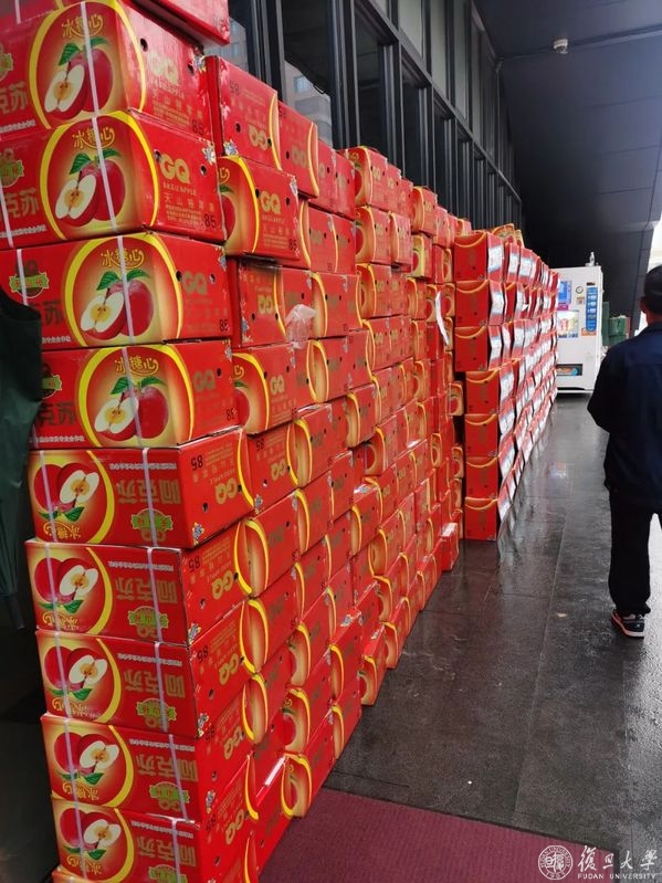 两天后,313箱由复旦大学EMBA浙江同学会共同出资捐赠的山东苹果从上海西郊运抵复旦各校区,并在学校各部门的通力配合下陆续发到了师生们手中。