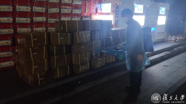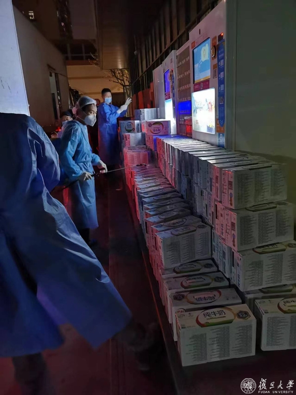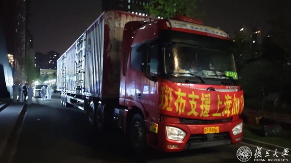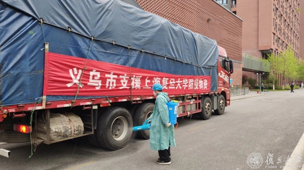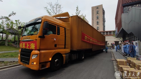 满载着义乌市政府捐赠物资的车辆驶入校区。本次义乌市政府为复旦大学提供了充足的日用百货物资,分送了各校区。物资涵盖洗漱用品、速食品、洗涤用品等17个品类近2000箱爱心物资。