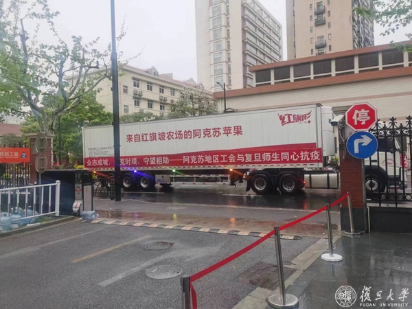 4月10日凌晨,由新疆阿克苏团地委和地区工会捐赠的阿克苏苹果正式由当地启运发往上海。21吨3600箱水果,横跨五千公里,历时四天三夜。终于,4月14日,一箱箱贴着“我们在一起”标识的阿克苏苹果顺利运抵复旦各校区,分拨给医学院的480箱也已顺利入库,近期正以陪餐水果的形式分发给在校师生。