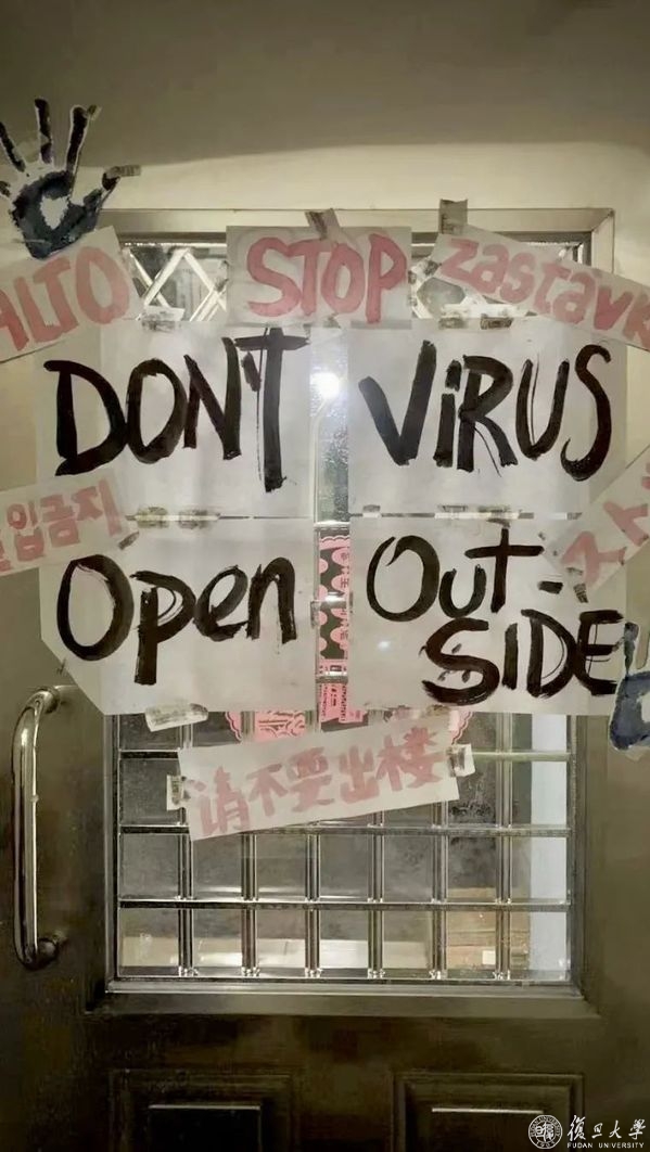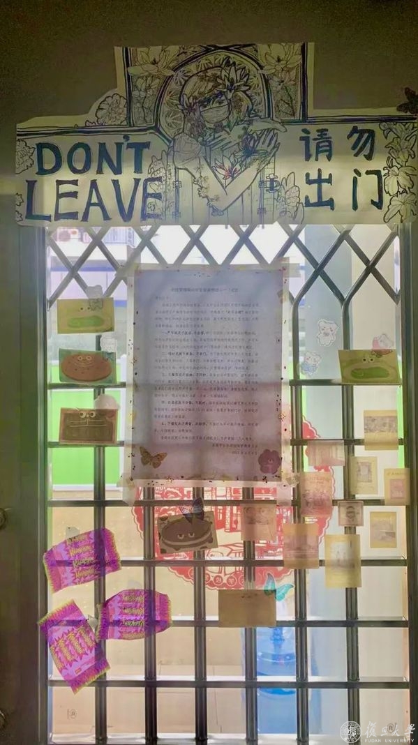 在楼宇封闭期间,为提醒同学们不要出楼,陈衍宏用自制海报装点了宿舍楼大门,后来也被其他楼长模仿并改良。