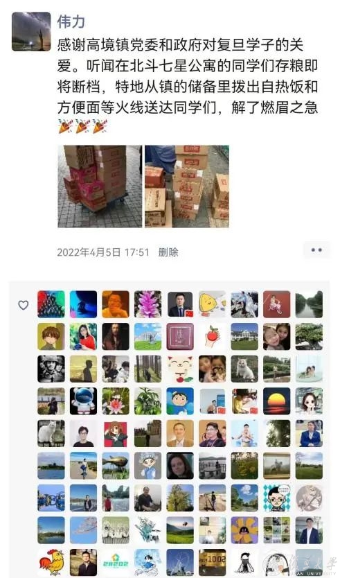 韩伟力了解学生们受助情况后,发出一条朋友圈:“感谢高境镇党委和政府对复旦学子的关心”。宝山-复旦的区校合作情,师生之间的暖心牵挂,温暖了特殊时期的无数人,让他们纷纷点赞,留下暖心的留言。