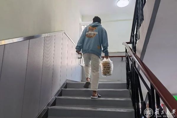 外国语言文学学院本科生陈灏奕是2层的楼层长,正在发放同学们的早餐。