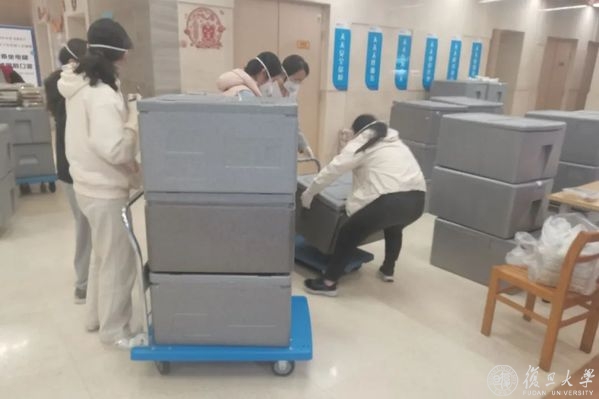 为了让同学们尽快吃到热饭,在副楼长袁晓妍、朱震宇、陈予安的牵头下,一至六楼的同学们构建了一条完整的“配餐链”:六个楼层分别成立盒饭志愿者队,确立一位楼层负责人,在大白志愿者将三餐取回宿舍楼下之后,各楼层的盒饭志愿者队来到宿舍楼一楼领取本楼层盒饭并带回进行发放。4月8日起,由于每日运餐工作量大,16号楼还向其他楼各院系男生志愿者请求支援,得到积极响应,完善了大白志愿者与楼层志愿者接力运送的送餐方式。这一合作模式不仅提高三餐配送效率,也在一定程度上减轻志愿者的工作负担。