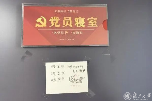 “早餐2份,午餐2份,晚餐2份。”另一间寝室门上贴着便利贴,上面注明了所需餐饭数量,还画着可爱的猫猫表情:“志愿者同学辛苦啦。”