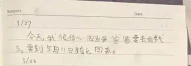 “今天,我很伤心,因为爸爸要去前线(抗疫)了。”这短短一句,是二3班冯同学发来的心情日记。了解到日记背后的故事后,班主任王老师不断与冯同学妈妈进行沟通,深入了解小朋友的居家学习、生活状态以及情绪行为表现。
