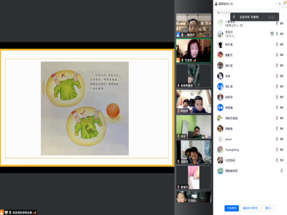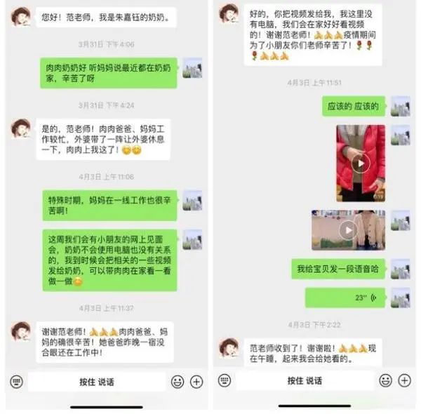 “和老人一起居家生活的幼儿,我们更加强对这类孩子的关怀和‘一对一’沟通,针对个别幼儿无法通过电脑进行每周的“云端互动”这一情况,我们会与孩子家人取得联系,进行‘一对一’的互动,将互动内容通过图片和语音的方式进行还原。希望用我们小小关怀,让奔赴在一线的家长多一份安心和放心。”班主任说。