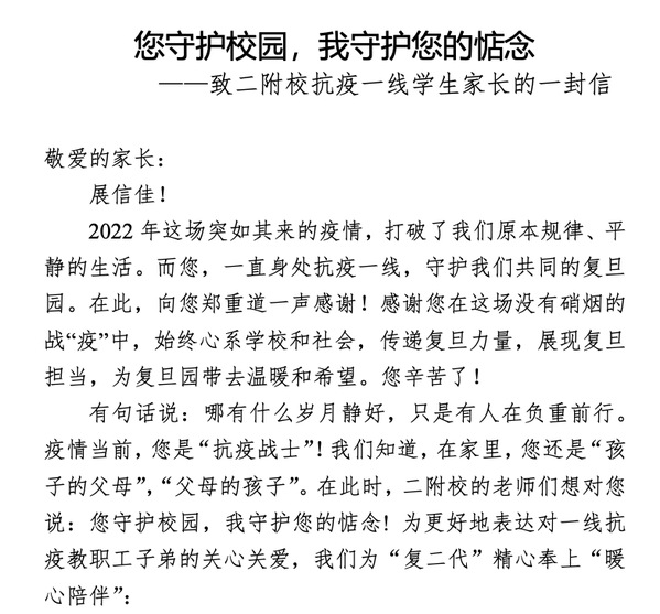“疫情虽在一定程度上造成了我们工作和生活的‘断档’,但二附校老师们的关爱不会断线。”在《致二附校抗疫一线学生家长的一封信》中,复旦大学第二附属学校(以下简称“二附校”)为“复二代”提供“暖心陪伴”,表达对一线抗疫教职工子弟的关心关爱。
