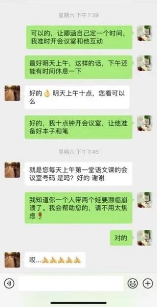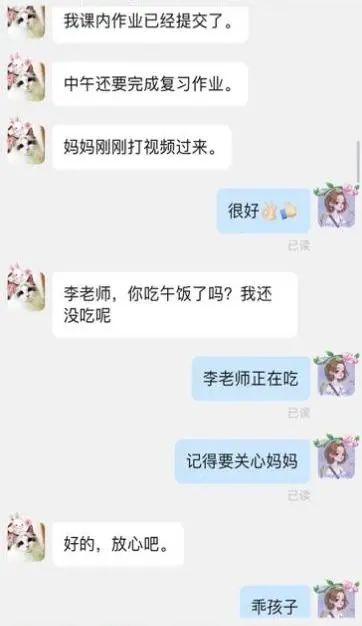 “不管是生活还是学习上,孩子遇到任何困难,我们一定会尽所能帮助解决”。班主任每天会关注饶同学的学习情况,如听课效率、作业质量等;课后也会时不时跟饶同学聊天,关注她在家的生活和心情。授课老师在课中也会留意孩子听课状态,课后视频交流近期所学所得。
