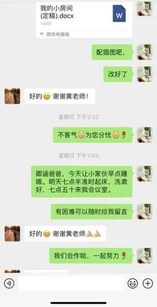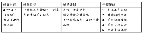每天中午12:30,王老师会和冯同学视频通话,了解孩子的心里状态,并为其制定辅导目标、辅导计划和干预策略等。王老师还通过强化正向认知,譬如让其通过小记者采访形式,来了解到自己爸爸的工作情况,增加对爸爸工作的理解和支持。