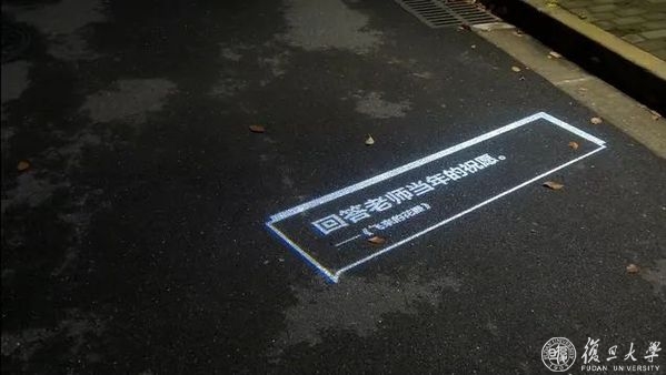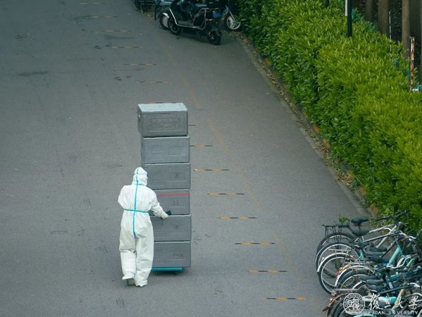 这是学校试行分区域网格化管理的第一天,在两个半小时的时段里,张诗媛和舍友可以分批错时在校园活动,每两天可以轮到一次。一下楼,她就看见学校为学生新添置的饮水机,旁边备了多桶水。在光华大道上,她发现了用灯光投射在地面的热门音乐歌词和评论,站着欣赏了好一会儿。沿着光草旁的那条路,她竟然还遇到了好几辆正在运送物资的“无人驾驶”车辆。张诗媛就这么静静地在校园走着。此时的校园,在她眼中,似乎比以往任何时候都更静谧。