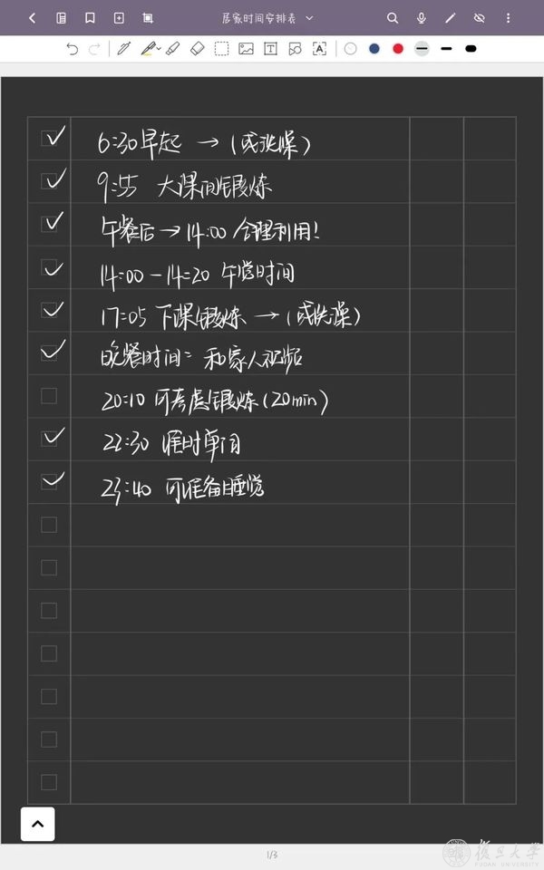 “静下来的状态可以抓紧平时碎片化的时间,让自己更纯粹投入想做的事情。”为了建立更好的学习生活习惯,赵晔开始为自己做详细的时间计划表。“一般每天晚上会先总结一下当天的计划完成度,再写第二天的时间规划,然后就去安心睡觉。每天这样的总结和规划会让自己学会更科学合理地安排时间。”赵晔说。除了学习,他还给自己安排了体育锻炼和午休的时间,放松调节身心。“每完成一项任务,就在清单上打个勾,看着勾越来越多,会觉得自己过得挺充实,也越来越有信心。”