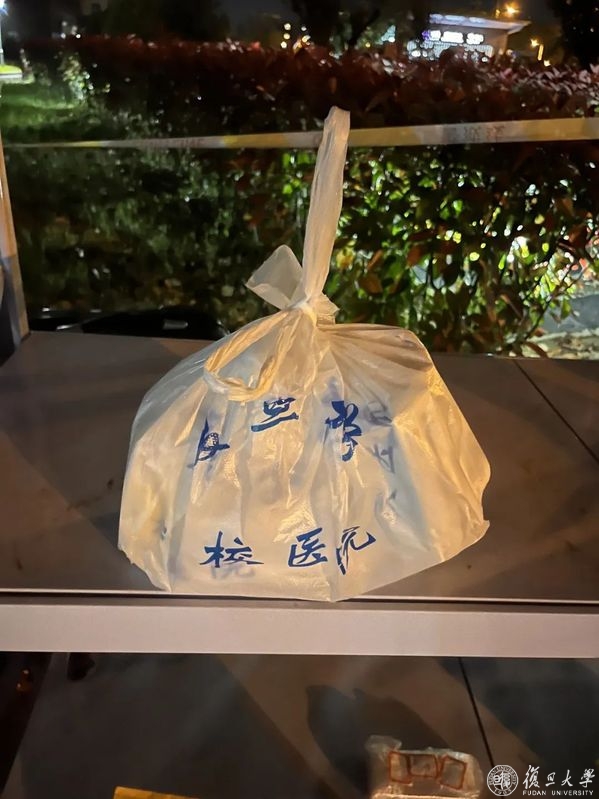 在确认使用该药品后,吴老师第二天晚上就从陈文燕手中收到了完成消杀静置的药品。据悉,为保障“生命通道”的畅通及时,各校区目前都已实现了校内用药“白天申请,晚上到药”的高效运转。每天晚上八九点左右,校医院的防疫车就会将一批通过“绿色通道”申请的校内用药送往江湾校区,为了让大家能尽快拿到药,陈文燕通常会在静置期一满就去取药,因此晚上九点左右,陈文燕就会送递前一天到的药,她一般会送到夜里十点多,忙的时候,有时也会送到十一、二点。