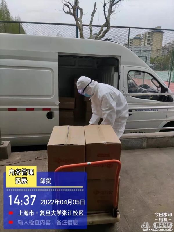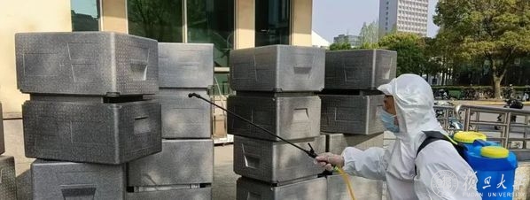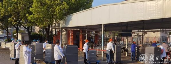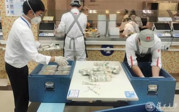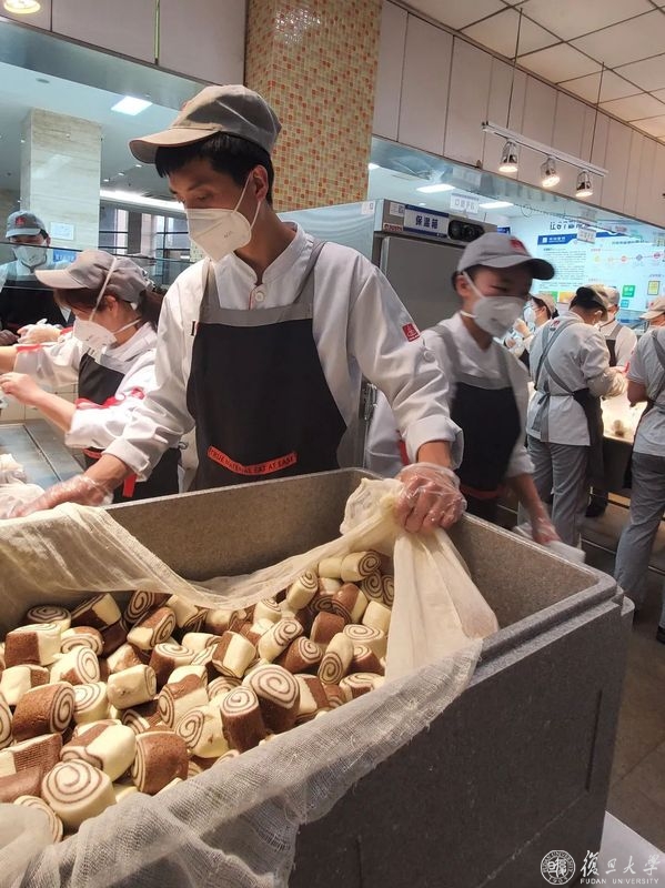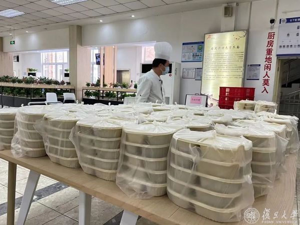 “早餐是最忙的。”旦苑千喜鹤餐厅负责人杜科农清楚记得,4月4日凌晨近两点,收到了学校严格落实封控管理、旦苑食堂需要向宿舍区配送三餐的消息。事情紧急,任务量大,他立刻叫醒尚在熟睡的20多位员工,动用大库中储存的半成品进行加工……从半夜忙到天明,第一天的3000余份早餐做好、打包,再由员工们统一装进50余个灰黑色大保温箱,通过小推车、三轮车等方式送到宿舍区。