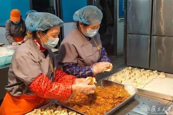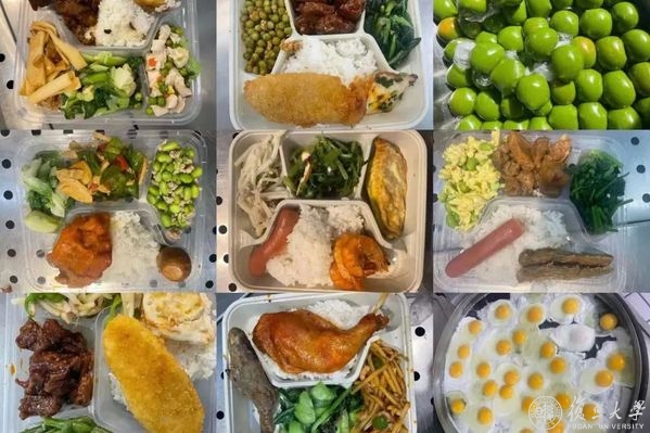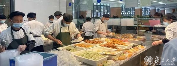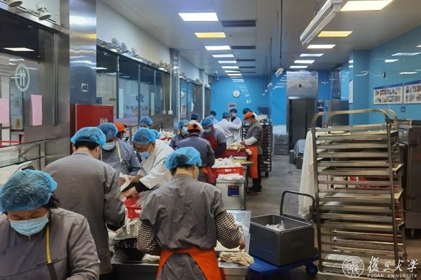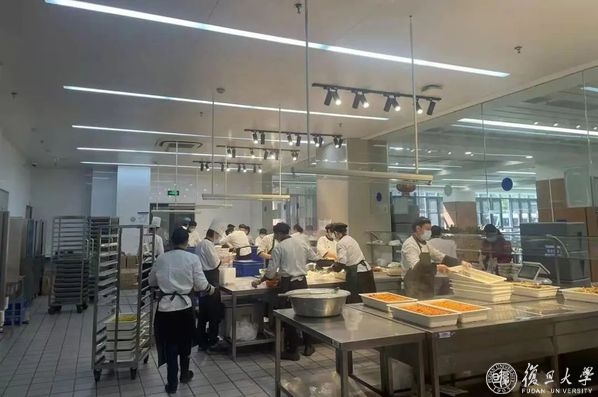 校园进入封控状态以来,旦苑食堂负责向东区、政通路宿舍区配送一日三餐,还曾向本部宿舍的人员提供即买即走式服务,每天出餐量超10000份。从接收食材、加工烹饪,到分类打包、统一配送,这些工作都由旦苑餐厅近70名留校后勤人员完成。