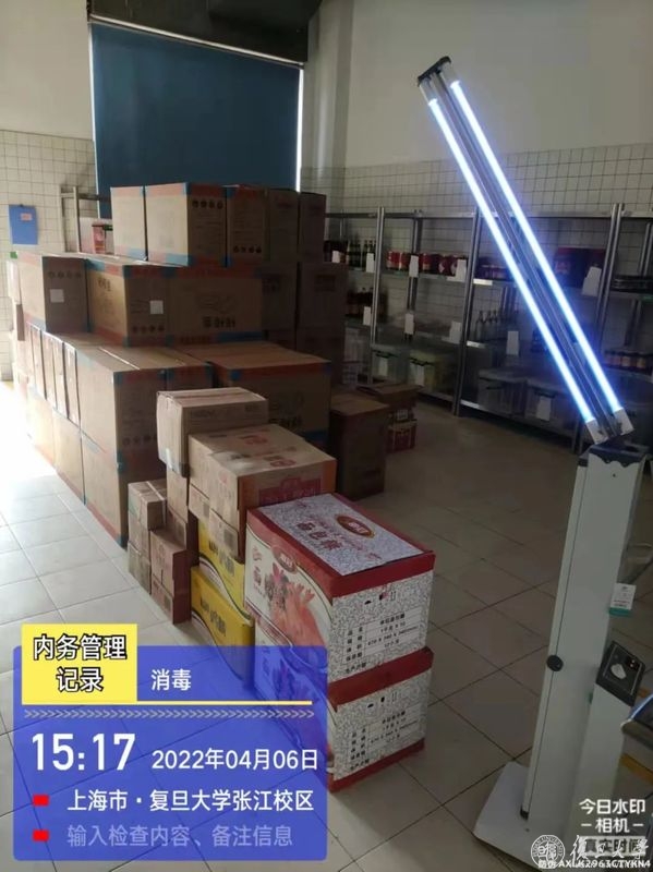 食材来得不易,进校需要进行严格消杀。货车开进校园,会有专人穿戴好整套防护装备,先对车辆整体消杀,搬运物资时,则对成箱产品六个外表面逐一消杀,对蔬菜等产品则利用紫外灯等进行处理。进校后,货车驾驶舱立即贴上封条,保证驾驶员和校内人员全程无接触。成吨成吨货物,全靠男员工们卸货、搬运、消毒、入库。