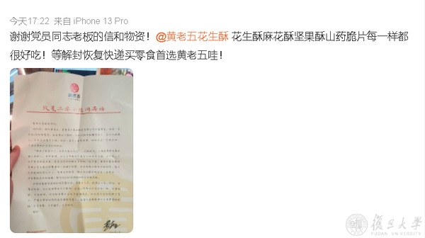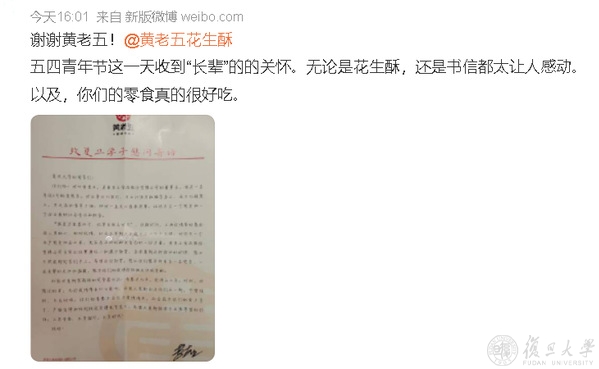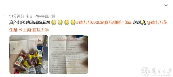 就在五四青年节这一天,第一批黄老五爱心礼包发放至复旦学子手中,同学们纷纷通过社交媒体表达感谢。