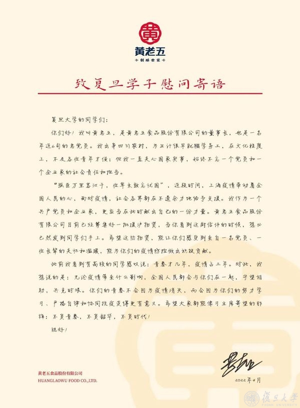 一份看似简单的食品包、一封《致复旦学子慰问寄语》,凝聚黄老五人的热忱而善良的心,更包含他们对复旦人的殷切期盼。