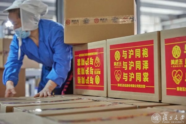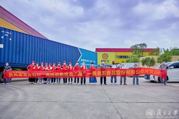 5月2日下午,悬挂着“长风破浪会有时 直挂云帆济沧‘海’——黄老五食品股份有限公司党支部”红色横幅的货车,抵达复旦大学邯郸校区。
