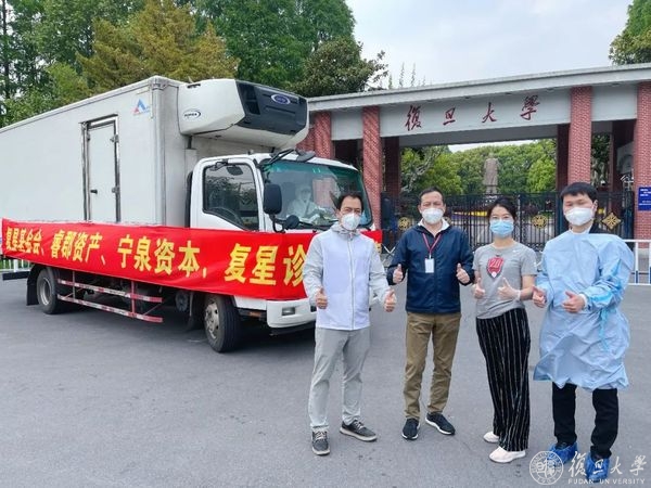 复星基金会理事长李海峰(左二)带队将第一批抗原试剂送达邯郸校区