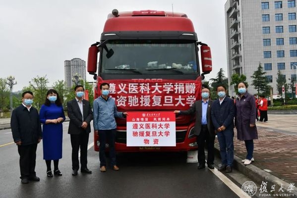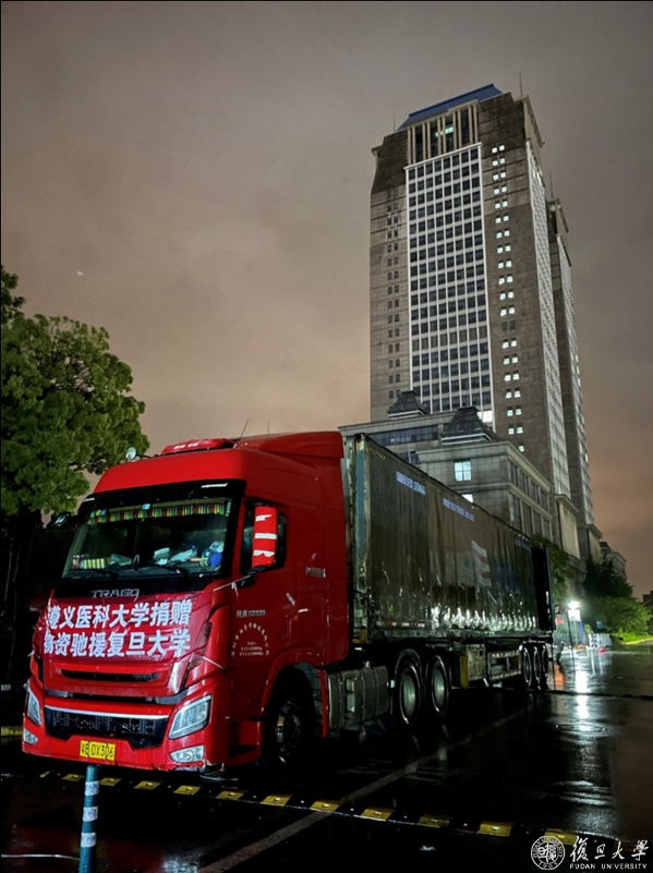 4月29日凌晨,经过一千多公里的长途跋涉,一辆悬挂着“山海情深、风雨同舟”“同气连枝、共占春风”标语的专用大货车,满载着遵义医科大学捐赠的生活物资,终于驶入复旦大学邯郸校区校门。