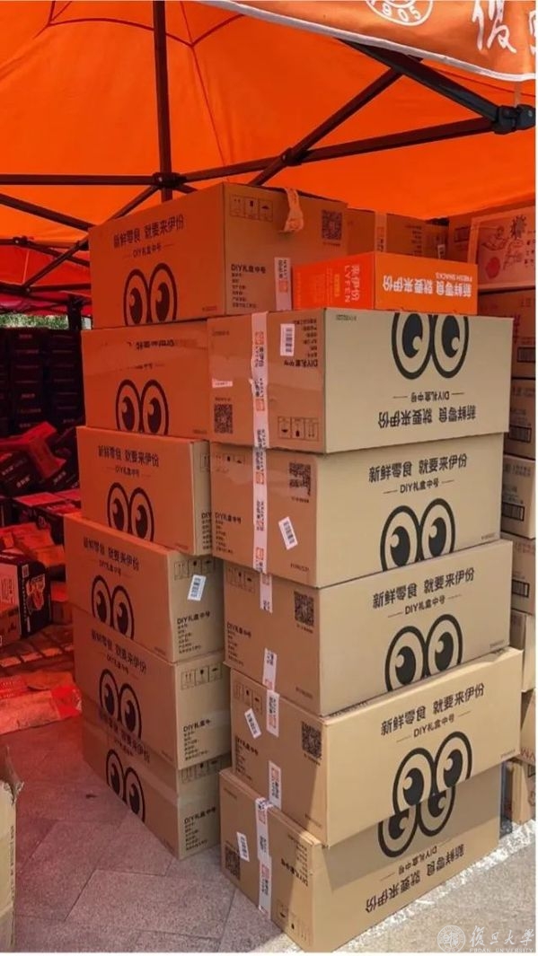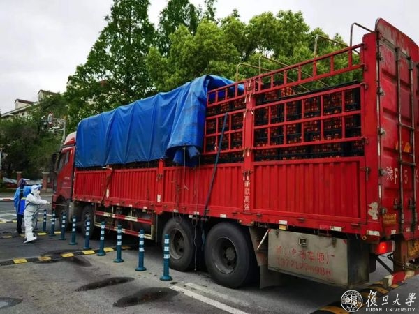 4月24日深夜,1000箱苹果、500箱梨和500箱沃柑从浙江平湖抵达复旦大学。