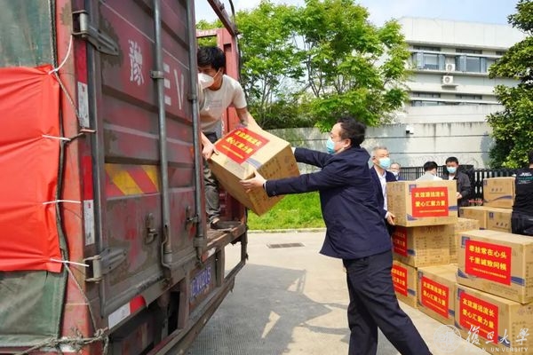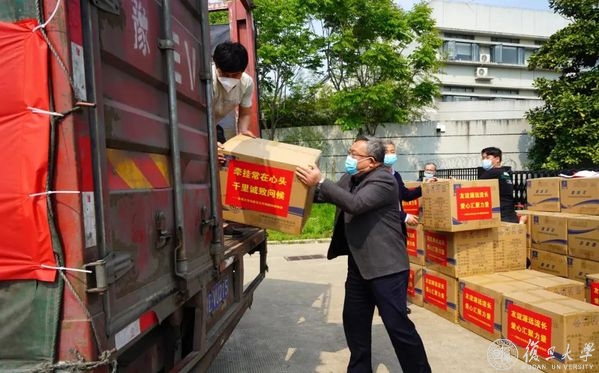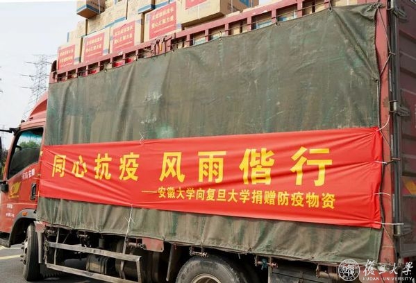 4月20日清晨,一辆悬挂着“守望相助 休戚与共”“同心抗疫 风雨偕行”标语、满载着安徽大学向复旦大学捐赠防疫物资的专用大货车缓缓抵达邯郸校区。