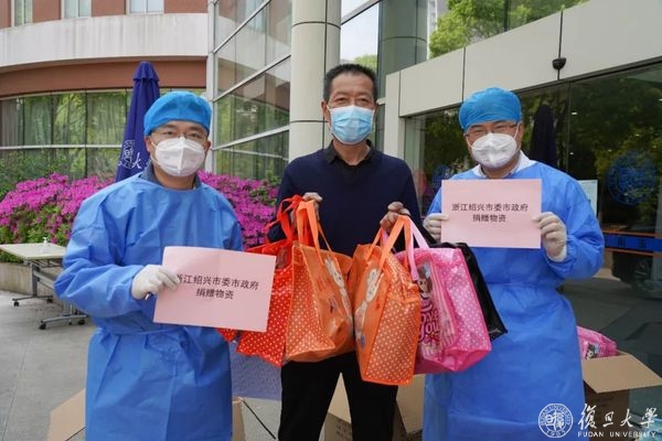 同一天,一批来自绍兴的生活物资也顺利到达复旦大学,绍兴市市委、市政府筹集了3500套T恤、裤子等物资,提供给疫情防控期间奋战在校园一线的教职工和后勤人员。