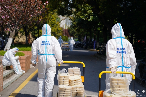身穿复旦蓝的青年志愿者举着喇叭,引导着做核酸的人保持安全距离,扫码、检测。一抹中国红,穿梭在宿舍楼之间:党员服务队的脚步从未停歇。