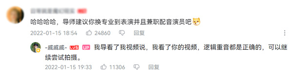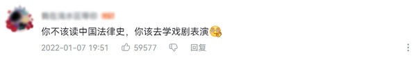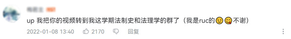 在得知自己的视频被许多老师转发后,戚宇辰的求生欲拉满,在自己视频的评论区留言,“我完了,要退学了”“老师们你们看到的话不要骂我!!我们专业是最棒的(之一)!!!”。但事实上,很多同专业的同学和老师都非常高兴,戚宇辰让更多人知道了法律史这一专业。