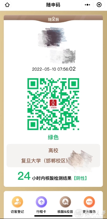 在复旦大学综合楼前,赵老师正从口袋中拿出手机,打开“随申办”APP扫描贴在展板上的“场所码”。“嘀”的一声,随即手机弹出页面,扫码时间、健康码、核酸记录等信息一应俱全。