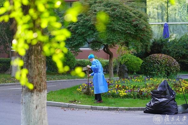 物业人员在校园里开始清扫落叶