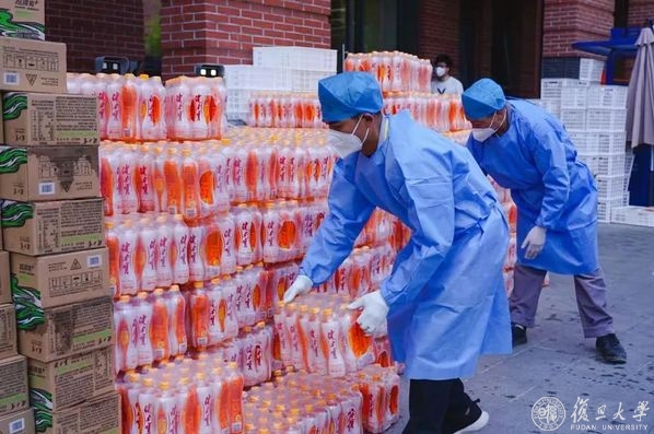 后勤人员正在搬运发放给学生们的爱心物资