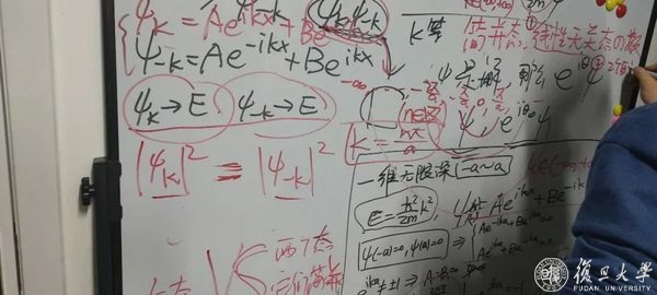 南区43号楼3021寝室里,一块写满公式的小白板前,2020级微电子学院本科生马宇杰、李坤龙、徐屹恒和廖珩四人正专注地讨论着各自对一维无限深势阱的薛定谔方程的理解。