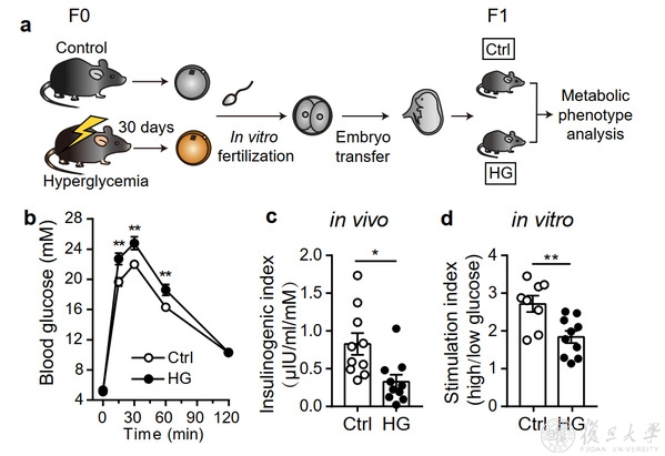 研究人员首先建立了链脲佐菌素(Streptozocin, STZ)诱导的孕前期高血糖小鼠模型,此后利用其卵母细胞在培养皿中进行体外受精,并将发育好的二细胞胚胎移植到正常代孕母鼠体内孕育子代。这种体外受精-胚胎移植(in vitro fertilization-embryo transfer, IVF-ET)系统能够排除孕期和产后环境变量的干扰,保证子代的表型完全来自于孕前期卵母细胞的不良暴露。研究者对孕前高糖小鼠卵母细胞发育而来的子代小鼠进行健康监测,发现其糖代谢受损,葡萄糖耐受能力不足(impaired glucose tolerance),主要表现为胰岛素分泌不足。有趣的是,孕前期高糖处理只能影响子一代小鼠,而在子二代小鼠中并未发现健康问题。