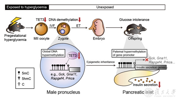 2022年5月19日,Nature在线发表了主要由黄荷凤教授与徐国良教授领衔、由浙江大学、复旦大学、中科院上海生命科学院与交通大学等多家单位合作完成的研究工作的最新研究成果“Maternal inheritance of glucose intolerance via oocyte TET3 insufficiency”。该研究揭示了孕前期的高糖环境可诱导卵母细胞中母源效应因子DNA双加氧酶TET3 (tet methylcytosine dioxygenase 3) 表达降低和功能减弱,改变胚胎DNA甲基化谱式,进而引发子代成年后胰岛素分泌相关基因等表达受限,最终导致子代呈现葡萄糖耐受不良。该工作提示卵母细胞TET3的正常功能可决定子代长期健康。
