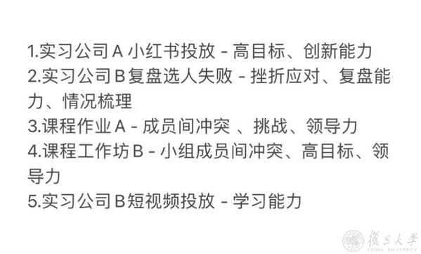 很多公司在招聘时,需要体现面试者的领导力和团队合作能力,在面试中,经常会问到是否有团队合作经历。我认为在学校中参加的商赛、小组作业、课堂报告就是非常好的练手机会。如何参与小组头脑风暴,协调成员分工,按计划推行方案,把想法有趣的呈现给课堂上的听众,我认为,自己之所以能在几轮面试中获得offer,是因为我把在日常里学到的东西、自己的思考,用复盘逻辑和方法论讲清楚。面试官觉得我是有道理的,是会学习,会思考的,这就足够了。