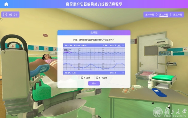 本实验以临床真实的产房全景为参照,打造可360度全方位展示虚拟产房的三维空间结构,实现全方位、多角度的观察,使人产生一种身临其境的感觉。实验利用动画、三维重建和数据可视化技术,模拟产妇在整个分娩期的生理和心理变化,如分娩疼痛、膀胱充盈、宫缩和胎心状况、胎盘娩出、阴道流血等,形象逼真地再现了临床产妇在正常分娩过程中常见的各类护理问题;利用真人语音导入技术,让学生在实操的过程中充分体验到真实的人机交互感,做到模拟产妇和学生之间的无障碍沟通和交流,引导学生将人文关怀的理念贯穿分娩全过程。