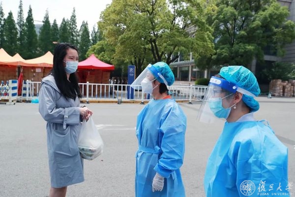 5月7日,复旦大学各校区、园区试行取餐制度。校党委书记焦扬、校长金力现场走访调研邯郸校区取餐情况。