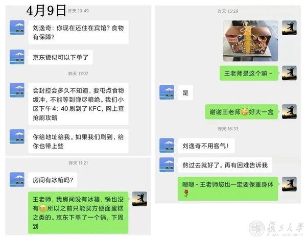 4月9日,食物已经见底,宾馆没有居委会和团购群,刘逸奇正在一筹莫展之时,王坚又一次发来微信:“现在还住在宾馆?食物有没有保障?”