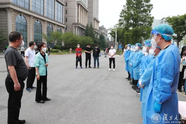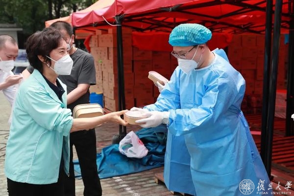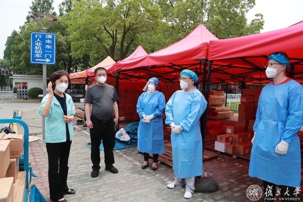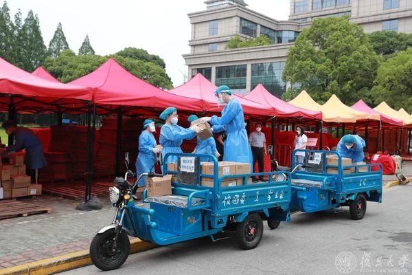 在物资安置点,机关职工志愿服务队成员正在将物资搬运至送货车,准备送往各个配送点。焦扬、金力一行对大家致以校庆日问候,表示在这次大战大考中,机关干部展现了不一样的风采,是学校的一支生力军。要发挥机关志愿者队伍的作用,释放学生志愿者压力,服务好学校立德树人的主业。大家冲锋在前,践行每个人的事业,学校为这支队伍感到骄傲光荣,相信在我们共同努力下,学校疫情防控一定可以取得胜利,“第一个复旦”的建设也一定可以大踏步地向前走。