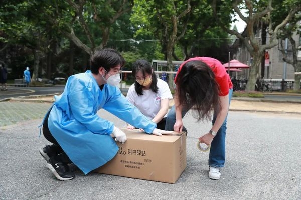 在本部菜鸟驿站,离校返乡的同学们正在打包寄运行李。“大家觉得托运行李的业务怎么样?”焦扬、金力一行来到快递中心前的空地,与正在办理行李托运的同学展开交流。“前几天还在发愁行李问题,没想到今天就解决了。”一位正在装箱的大四毕业生回答。焦扬仔细询问了学生离校返乡情况,叮嘱同学们在旅途中做好防护。