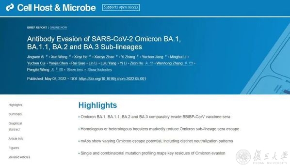5月8日,Cell Host & Microbe在线发表了复旦大学王鹏飞、张文宏以及胡子欣团队题为:Antibody Evasion of SARS-CoV-2 Omicron BA.1, BA.1.1, BA.2 and BA.3 Sub-lineages的研究论文。研究进一步证实,对于适宜接种的人群,推广疫苗加强针注射仍然是预防SARS-CoV-2传播,特别是应对奥密克戎株传播的有效手段之一。奥密克戎株疫情虽然较原始株及Delta株的病死率及重症率有所下降,但仍可导致高龄人群或免疫缺陷人群重症率的增加,因此,对适宜接种的人群,进一步提高全程疫苗接种及加强接种比例十分重要。