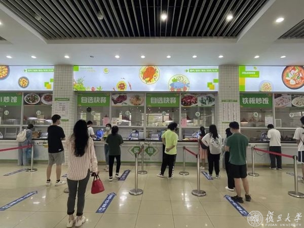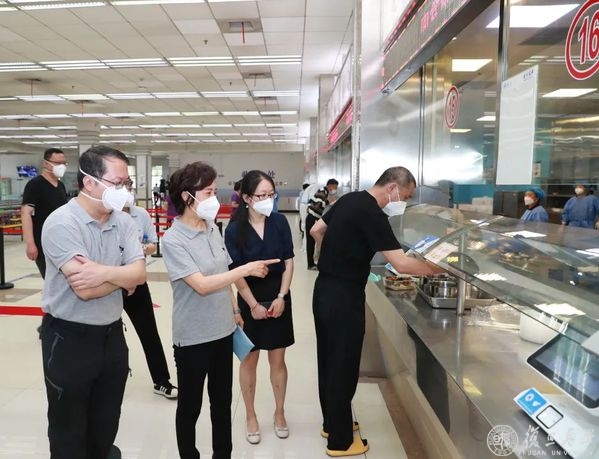 “请各位老师同学进入食堂前,扫描场所码。”今天,食堂开放现场打包购餐服务,在旦苑餐厅,焦扬一行现场察看备餐和取餐情况,与工作人员展开交流,详细了解餐品供应、储备和取餐动线设计情况。