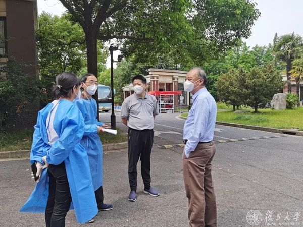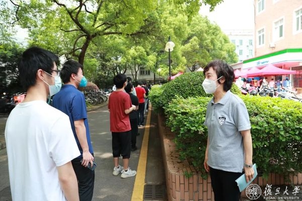 为保障科研不断线,部分师生留守院系,入住江湾工作园区院系楼内。校园转入新一轮准封闭管理后,学校提供专车,接送学生返回生活园区。在环境楼前的乘车现场,裘新、张人禾察看情况,了解仍在楼内住宿师生的学习生活安排,叮嘱相关负责人做好保障工作。