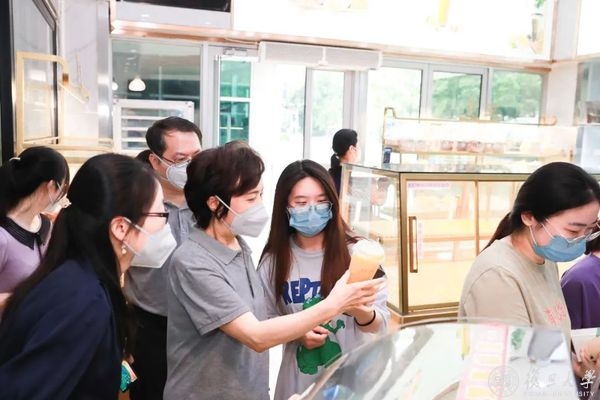 在面包房的冷藏柜中,整齐地摆放着食堂自制双皮奶,陈列柜里不同品种的奶茶供师生自行挑选,工作人员正在摆放面包和点心。“你们都买了什么?喜欢吃什么?”“我买了杨枝甘露,等了两个月终于喝到了。”在旦苑餐厅一楼的面包房前,焦扬与前来购买的学生交流。