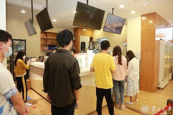 不少学生排队在北区食堂二楼水吧购买饮品,金力叮嘱学生们注意保持排队距离。看到四名来自台湾的管理学院应届毕业生,金力询问毕业去向,祝愿她们前程似锦。