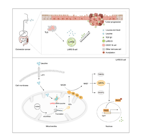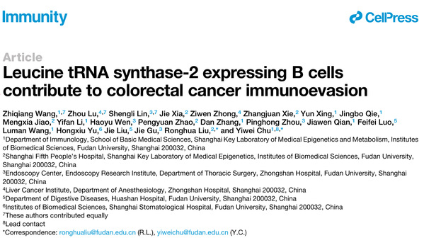 2022年6月3日,复旦大学储以微团队在Immunity杂志上发表了题为Leucine tRNA Synthase-2 Expressing B cells Contribute to Colorectal Cancer Immunoevasion的研究论文。团队利用单细胞技术分析了结直肠癌(Colorectal cancer, CRC)不同阶段的肿瘤浸润B细胞,发现一群高表达亮氨酸tRNA合成酶2(LARS2)的B细胞新亚群(LARS B)。这群LARS B不仅具有TGF-β1主导的调节性特征,而且具有亮氨酸营养偏好。因此,研究者从营养与代谢视角解析了肿瘤浸润B细胞获得调节功能的机制,并提出通过限制亮氨酸饮食清除LARS B细胞、激活抗肿瘤免疫效应。