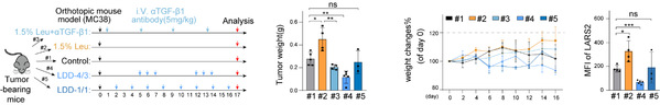 研究团队分析了LARS B形成的原因和功能。他们发现,相比其他氨基酸,亮氨酸在肿瘤浸润B细胞内呈现高富集现象;在化学诱导和原位肿瘤两种CRC小鼠模型中,高亮氨酸饮食使肿瘤局部产生更多的LARS B,促进肿瘤进展(图2)。过继转输Lars2缺失的B细胞至免疫缺陷小鼠(CD79a-/-)以及在B细胞中条件性敲除Lars2(Cd79a-Cre Lars2fl/fl),肿瘤明显减小,并伴随着TGF-β1的分泌以及Treg的减少。LARS B对TGF-β1依赖的调节性特征和对Treg形成的影响,也通过LARS B分选、T/B细胞共孵育以及Tgfb1条件性敲除小鼠得到了验证。